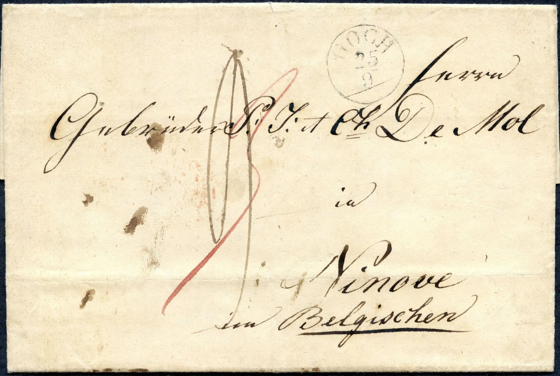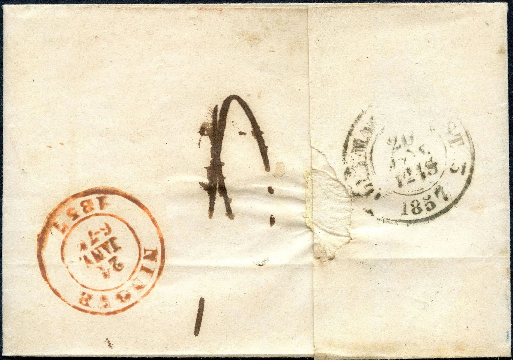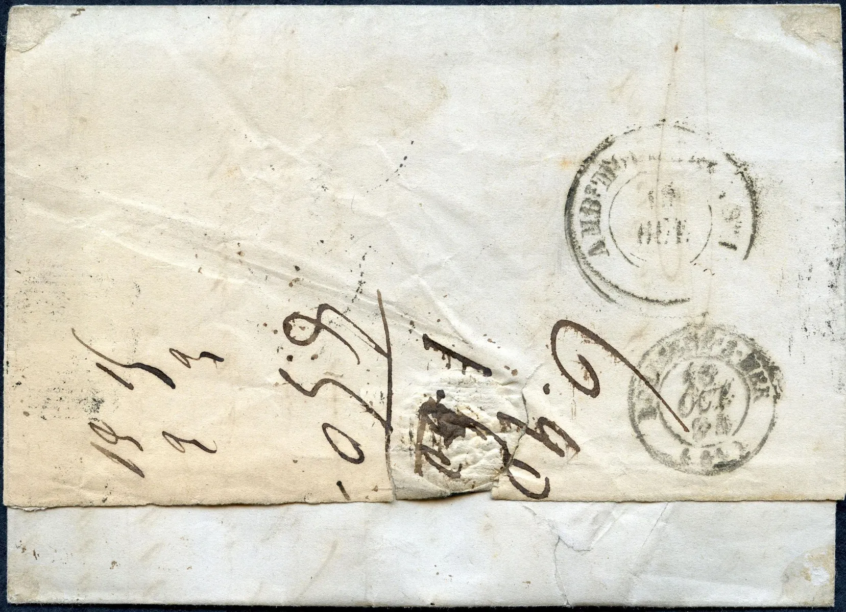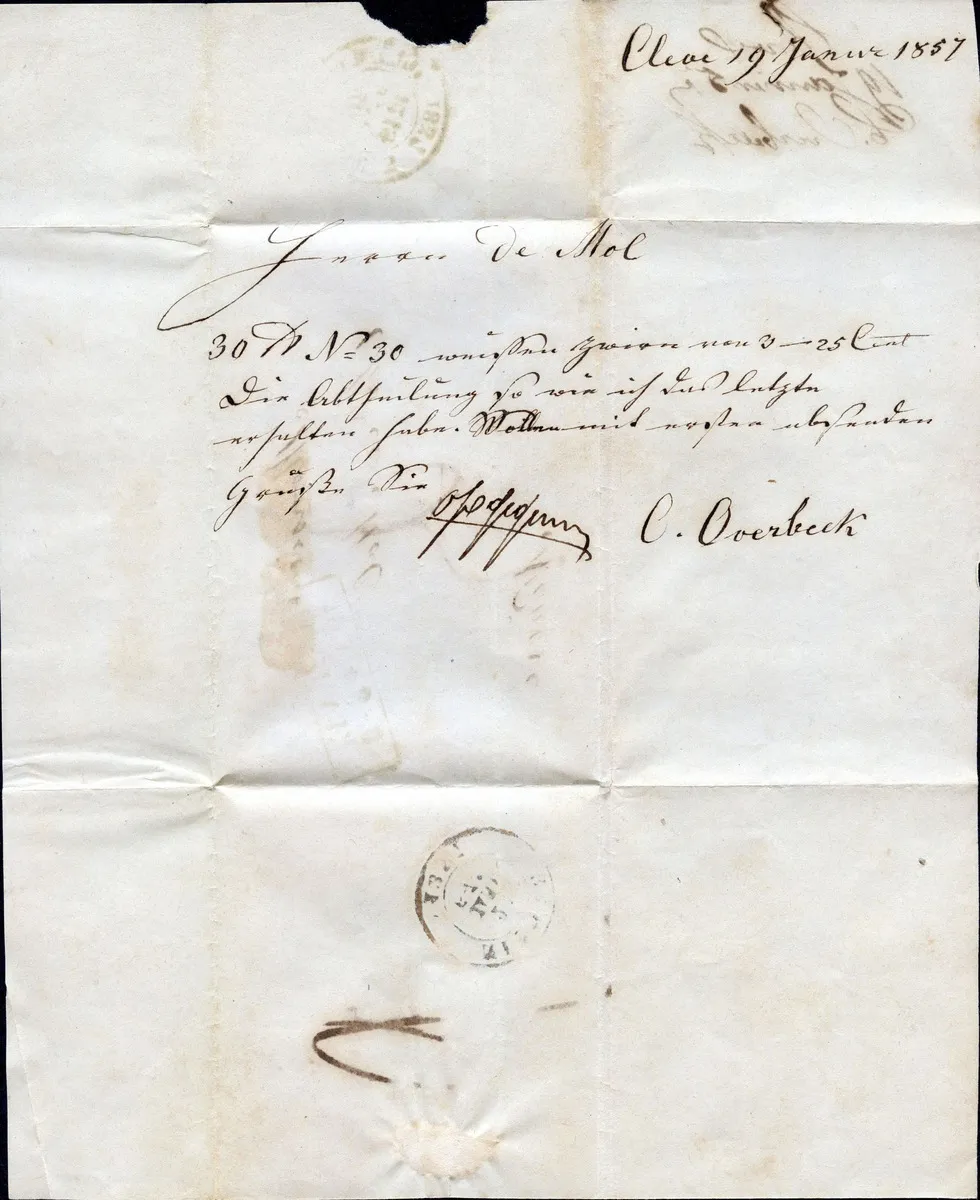 Das Gewicht ist links oben mit 32 Gr angegeben, also ein schwerer Brief mit etlichen Einlagen. Damit war der Brief im 3. Gewicht und wurde mit 30 Cent belastet an Preußen übergeben. Diese 30 Cent entsprachen 5 Sgr. Am Tag der Aufgabe war der Brief laut Stempel mit der Bahnpost Emmerich-Oberhausen unterwegs. Die preußische Taxierung auf der Rückseite wurde mit dem Siegel fast komplett entfernt.
