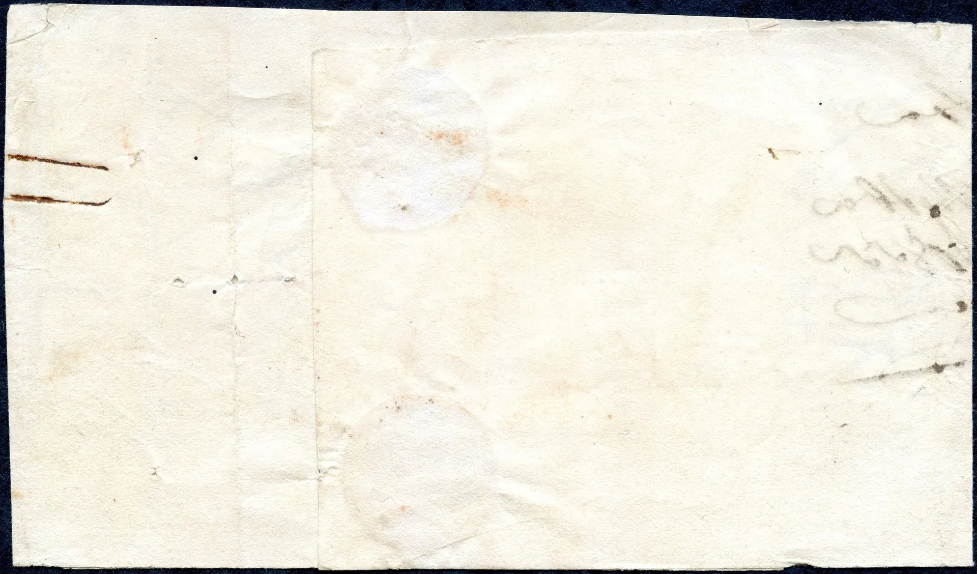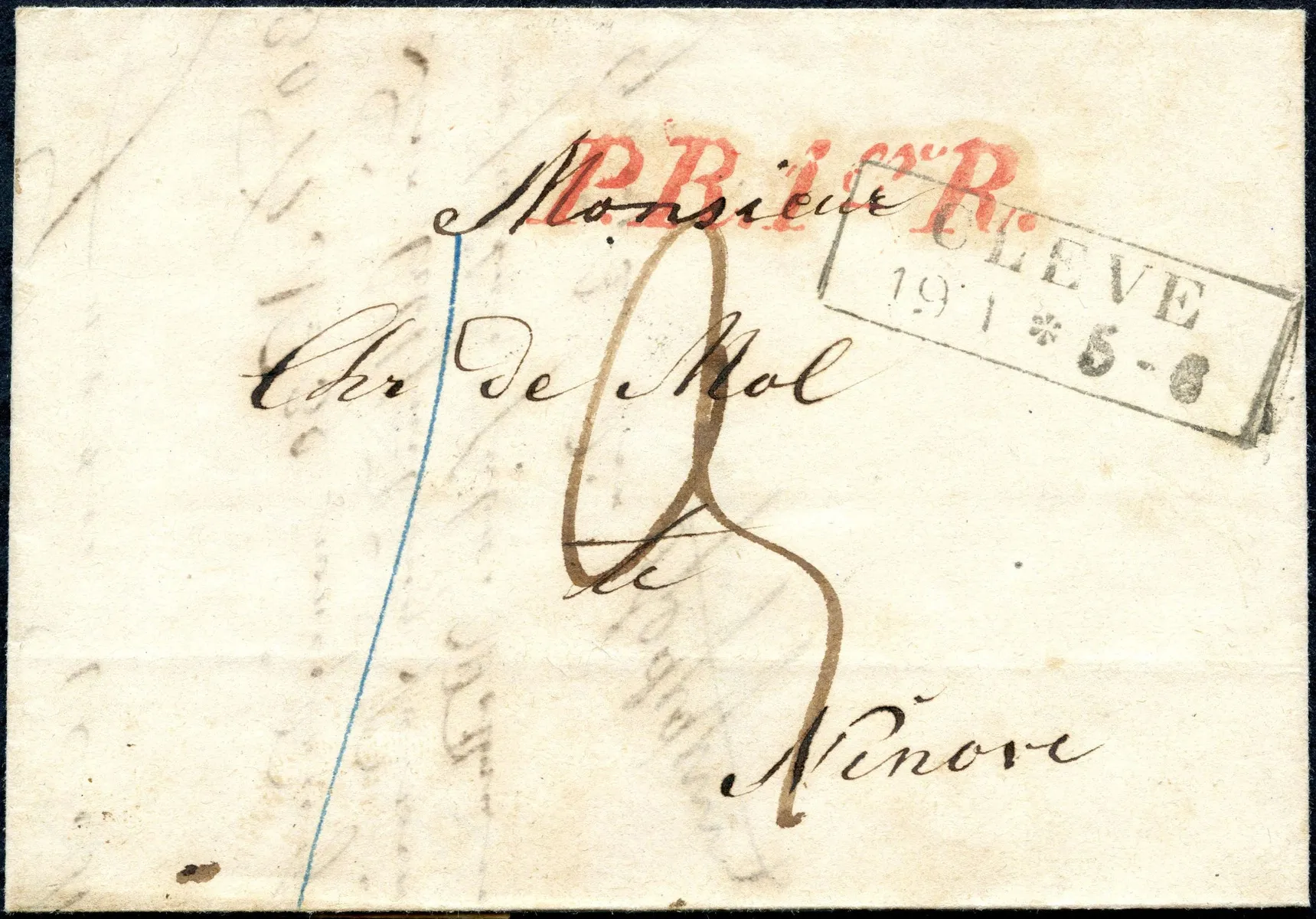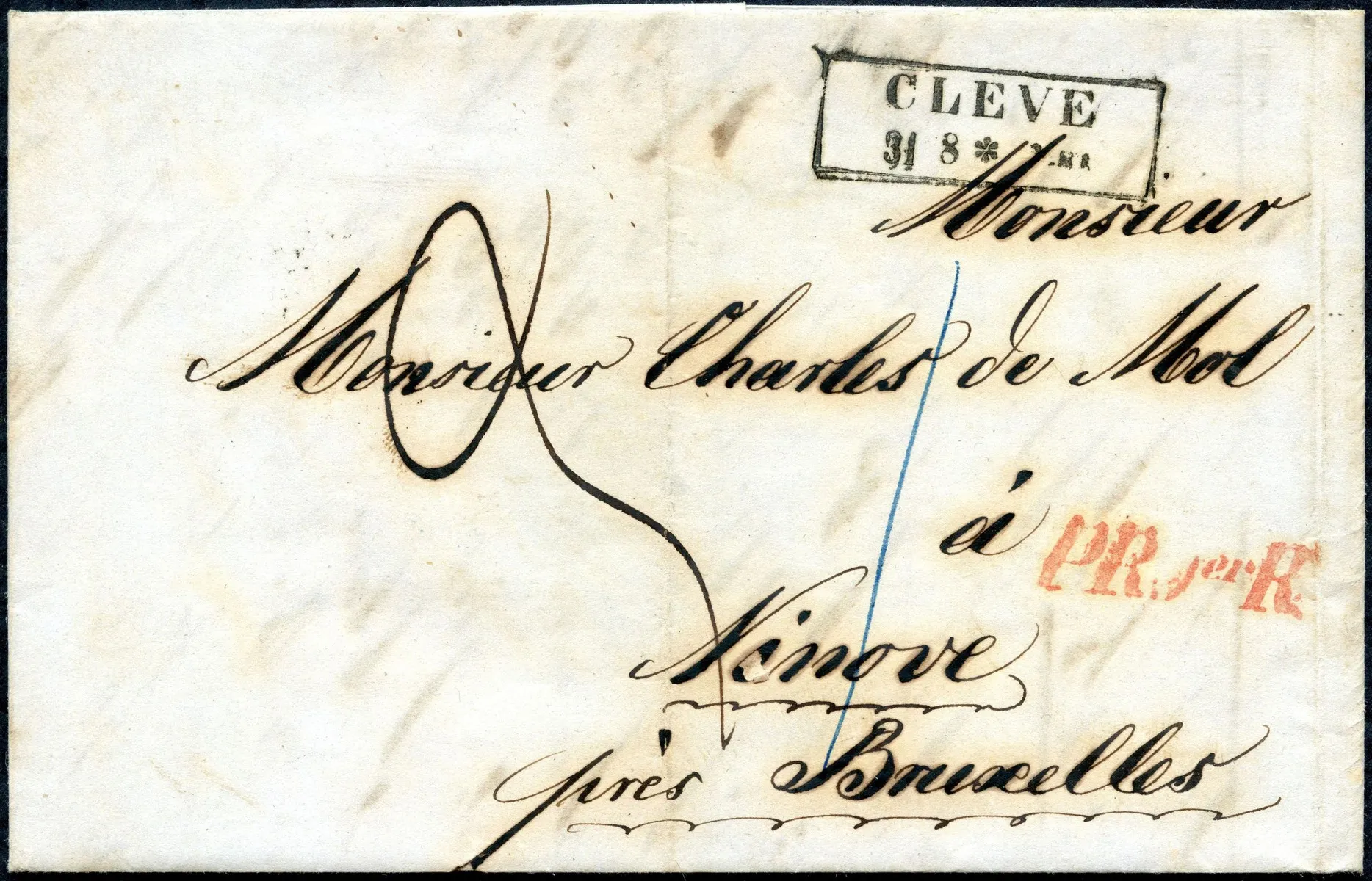 Das Gewicht ist links oben mit 32 Gr angegeben, also ein schwerer Brief mit etlichen Einlagen. Damit war der Brief im 3. Gewicht und wurde mit 30 Cent belastet an Preußen übergeben. Diese 30 Cent entsprachen 5 Sgr. Am Tag der Aufgabe war der Brief laut Stempel mit der Bahnpost Emmerich-Oberhausen unterwegs. Die preußische Taxierung auf der Rückseite wurde mit dem Siegel fast komplett entfernt.