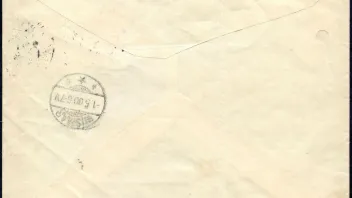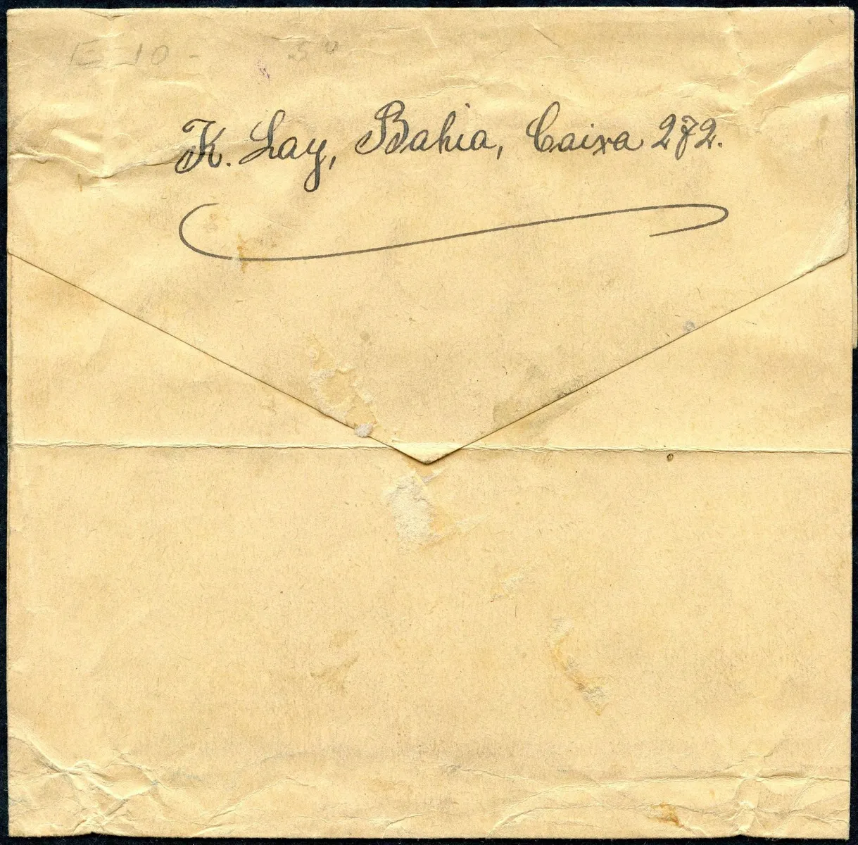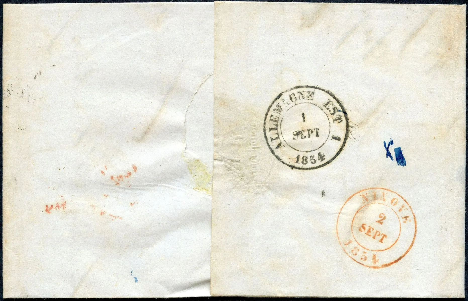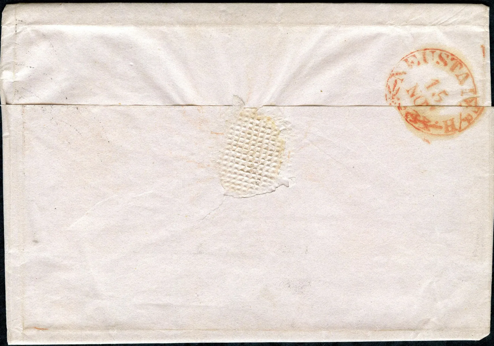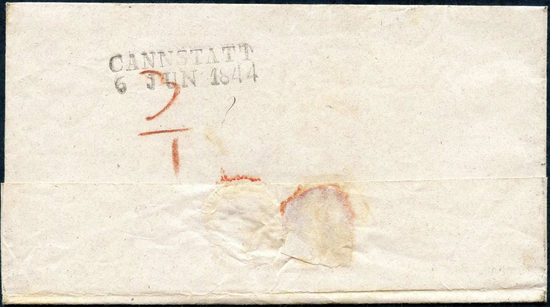 Das Gewicht ist links oben mit 32 Gr angegeben, also ein schwerer Brief mit etlichen Einlagen. Damit war der Brief im 3. Gewicht und wurde mit 30 Cent belastet an Preußen übergeben. Diese 30 Cent entsprachen 5 Sgr. Am Tag der Aufgabe war der Brief laut Stempel mit der Bahnpost Emmerich-Oberhausen unterwegs. Die preußische Taxierung auf der Rückseite wurde mit dem Siegel fast komplett entfernt.